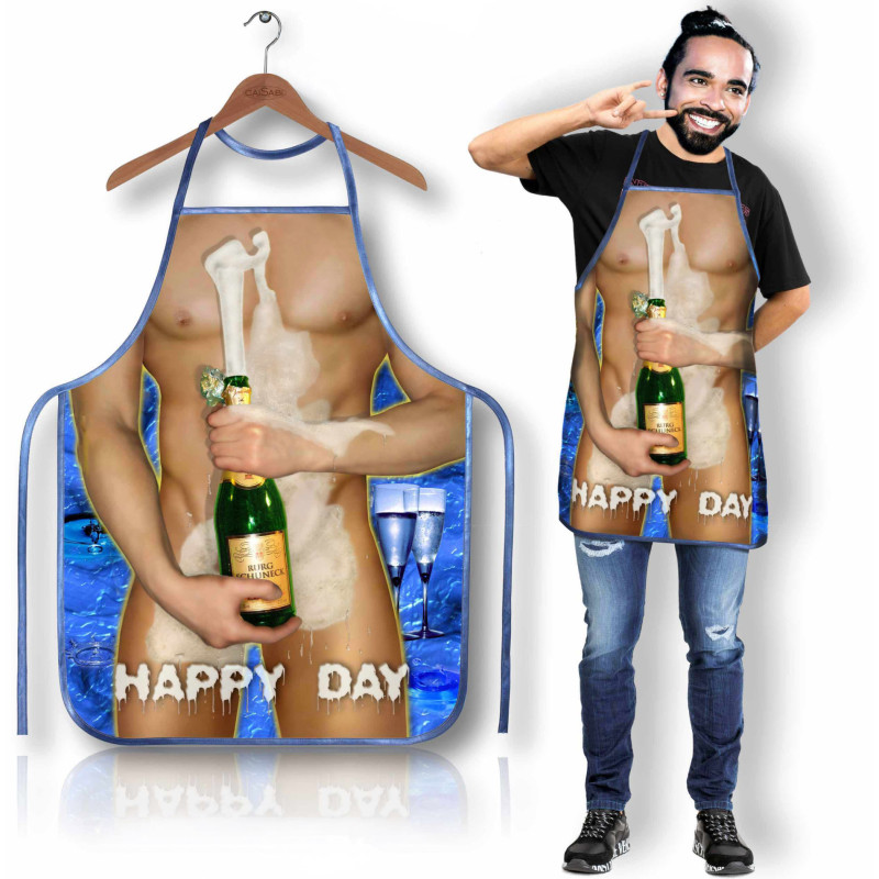 Dominantním prvkem je realistický potisk nahého, vypracovaného trupu, který drží láhev šampaňského, doplněný o hravou splývavou pěnu. Tento design zaručeně vyvolá smích, lehký ruměnec a okamžitou pozornost okolí. Zástěra působí drzým, ale stále elegantně zábavným dojmem.