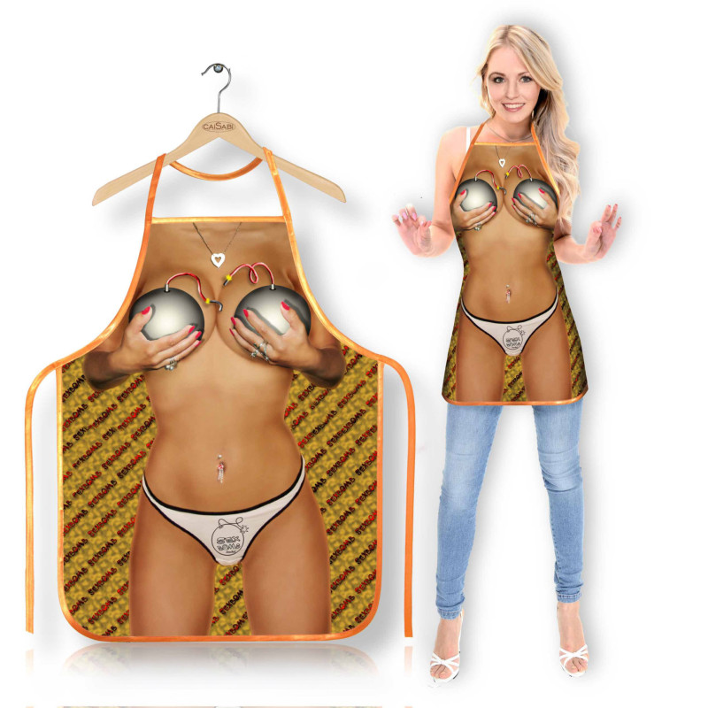 Dominantou zástěry je realistický 3D potisk nahého ženského těla, které drží dvě stylizované „bomby“ v kresleném, hravém pojetí. Doplněno o drzý detail na kalhotkách vytváří design, který okamžitě přitáhne pozornost a vyvolá úsměv na tváři. Zástěra působí sexy, zábavně a zároveň lehce provokativně.